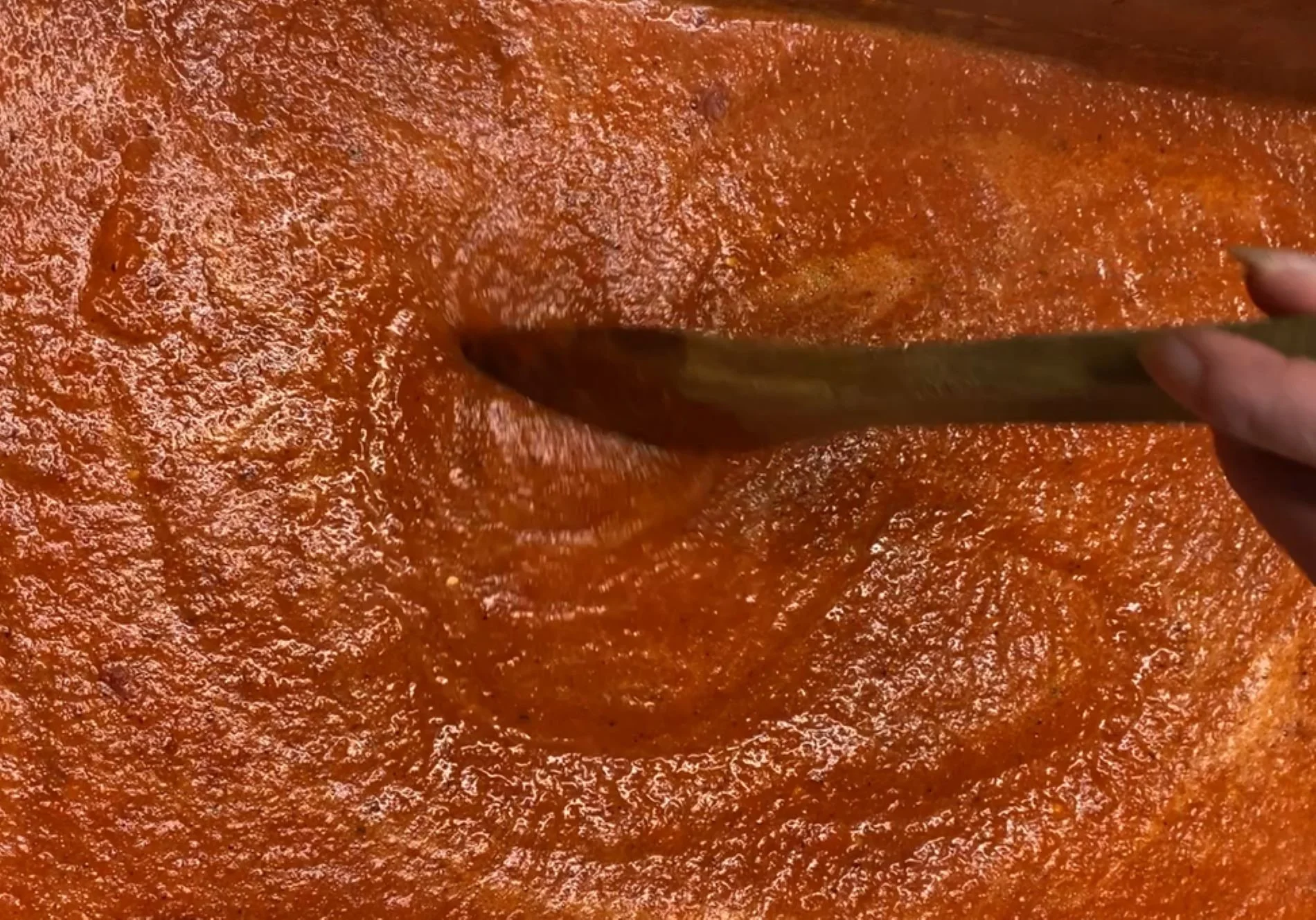 First we blitz roasted skinned red peppers (don’t be waiting for summer - canned roasted peppers are absolutely fine) with chillies, sugar and salt, to a liquid. Getting this puree to a thick spread is a long game; we pour it into a pan and let it slowly roast for hours at a low temp. We stir the liquid every hour or two, checking its progress to becoming thick and shiny. As it thickens, the aroma intensifies, filling the kitchen with intoxicating fragrance and a complex flavour that is uniquely its own. When it has hit the consistency we can confidently call a paste, it’s done and ready to work its magic. You can stockpile this red pepper paste in small batches in the freezer, ready to add a capsicum vibe to anything from hummus to tahini sauce.
