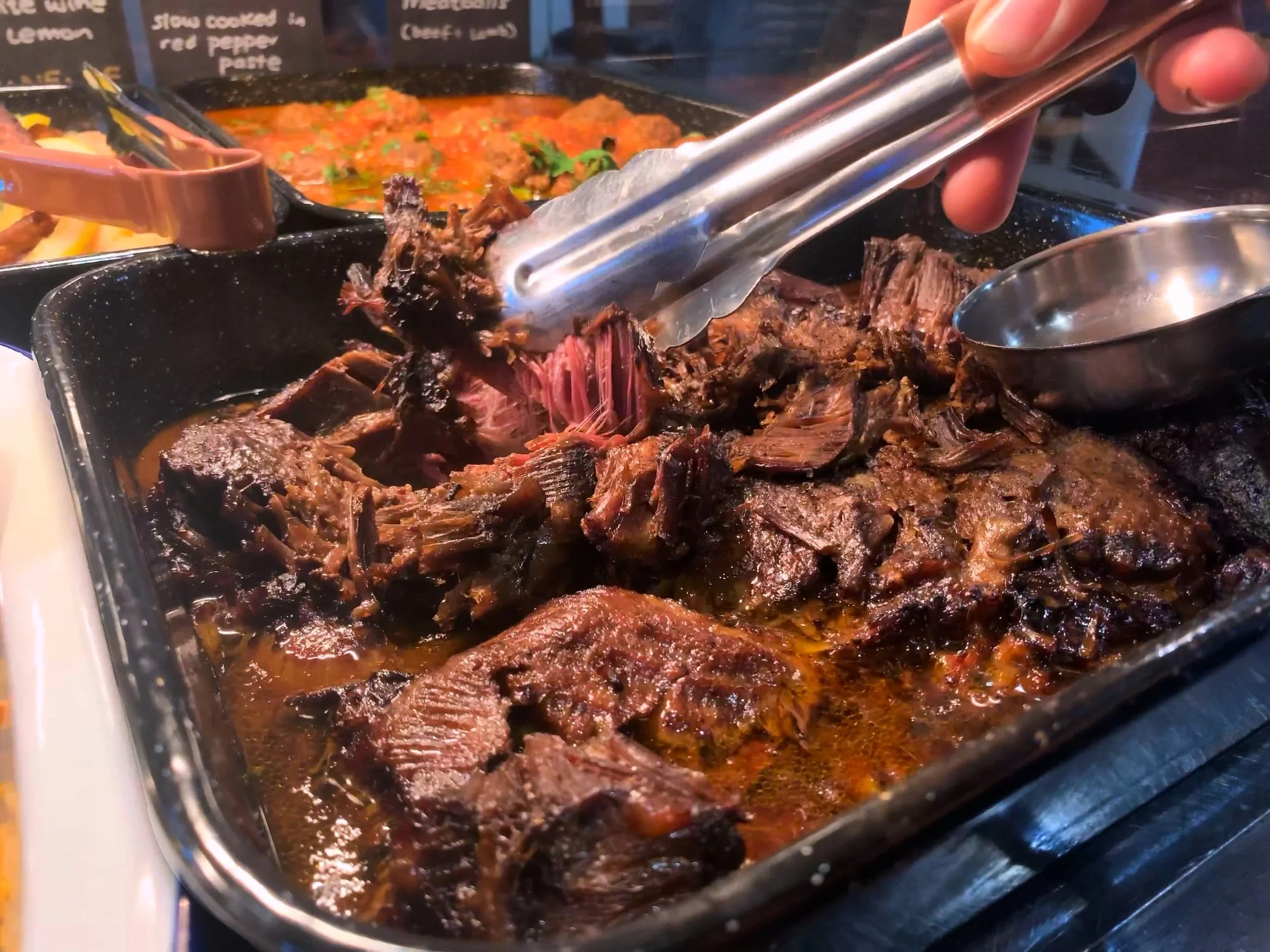 The last job for the kitchen team every day is to fill every available oven with trays of beef cheeks to cook overnight. The cheeks, bathing in marinade, master stock and (our homemade) chicken stock are tightly sealed with paper and foil, then cook while we sleep, at 110 degrees. In the morning, the whole shop is bathed in delicious beef cheek aroma. The trays are opened, a squeeze with the tongs confirms they’re falling apart tender and silkily perfect and that’s it. Slow cooking, done and ready to serve. Fast.